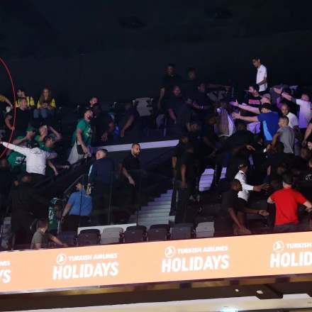 Οι Έλληνες οπαδοί ξεκίνησαν την ρίψη αντικειμένων μεταξύ τους, με τις Αρχές και την ασφάλεια του γηπέδου να κάνουν παρέμβαση ώστε να αποκλιμακωθεί η ένταση.