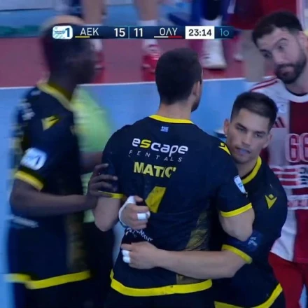 Λίγο πριν το τέλος του πρώτου ημιχρόνου στον τρίτο τελικό του χάντμπολ ανάμεσα σε ΑΕΚ και Ολυμπιακό υπήρξε μια στιγμή έντασης.