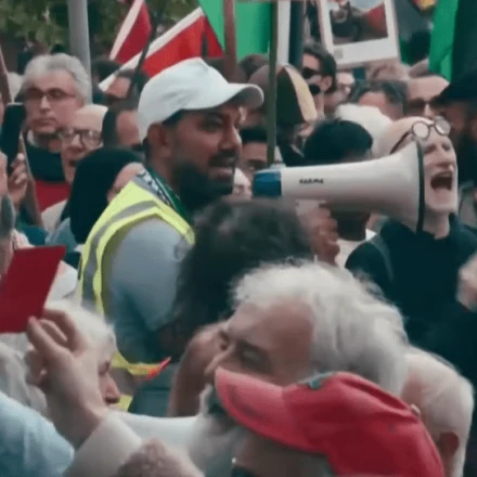 Οι διαδηλωτές φώναζαν συνθήματα, όπως «Ελεύθερη Παλαιστίνη», ενώ είχαν και διάφορα πανό, ένα εκ των οποίων έγραφε «Δώστε κόκκινη κάρτα στο Ισραήλ».