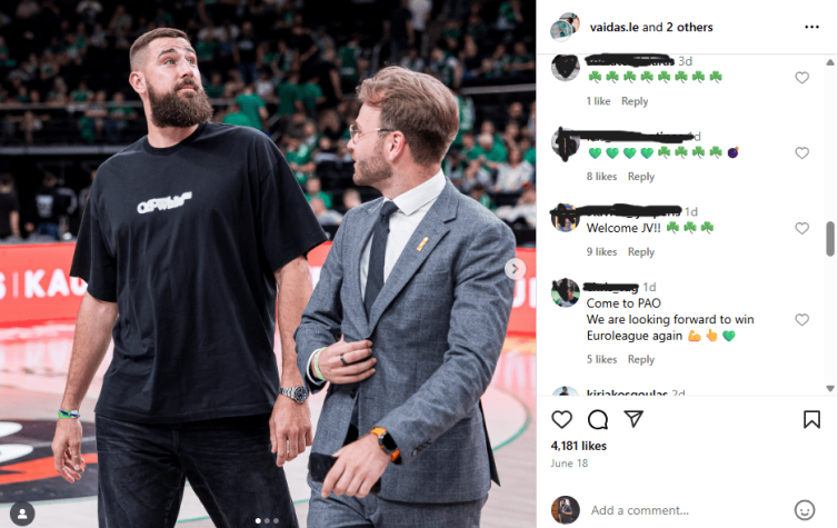 Χαρακτηριστικά είναι τα σχόλια στην τελευταία φωτογραφία που υπάρχει στο προφίλ του στο Inastagram, με τις προτροπές να έρθει στον Παναθηναϊκό, αλλά και τα τριφύλλια να δεσπόζουν στα μηνύματα, δείγμα του πόσο περιμένουν άπαντες την άφιξη του Λιθουανού σταρ στη χώρα μας.