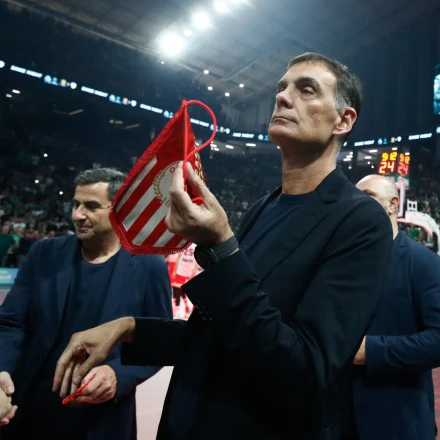 Ο Εργκίν Αταμάν και ο Γιώργος Μπαρτζώκας βρέθηκαν μπροστά στη γραμματεία του κλειστού των Ολυμπιακών Εγκαταστάσεων για να ανταλλάξουν χειραψία και λάβαρα, πριν το τζάμπολ του τρίτου τελικού ανάμεσα σε Παναθηναϊκό και Ολυμπιακό.