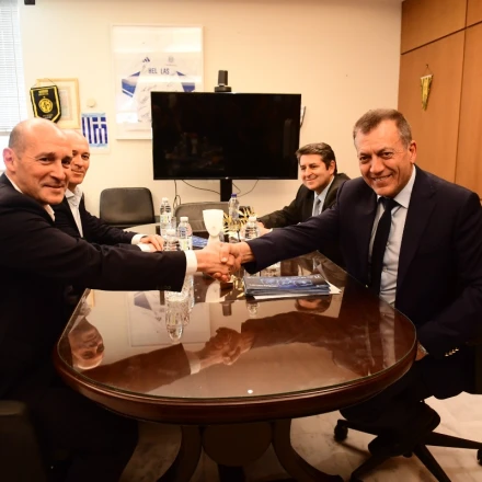 Μαζί με τους διοικητικούς ηγέτες του Ολυμπιακού, στο γραφείο του Γιάννη Βρούτση είναι και ο Νίκος Λεπενιώτης με τον Χρήστο Μπαφέ.
