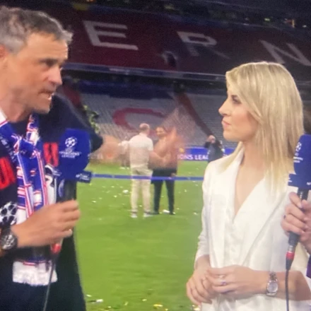Μετά την ολοκλήρωση του ιστορικού τελικού στον οποίο συνέτριψε την Ίντερ (5-0), ο Λουίς Ενρίκε μίλησε στα μικρόφωνα του Movistar και συνομίλησε με τους Άλβαρο Μπενίτο, Μόνικα Μαρκάντε και Σουσάνα Γκουάς.