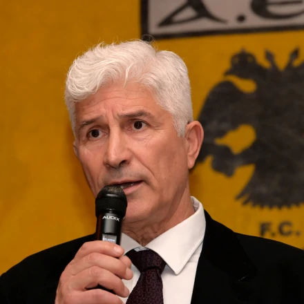 Ο Στέλιος Μανωλάς στην κοπή της πρωτοχρονιάτικης πίτας των Παλαίμαχων της ΑΕΚ / Πηγή: Intime