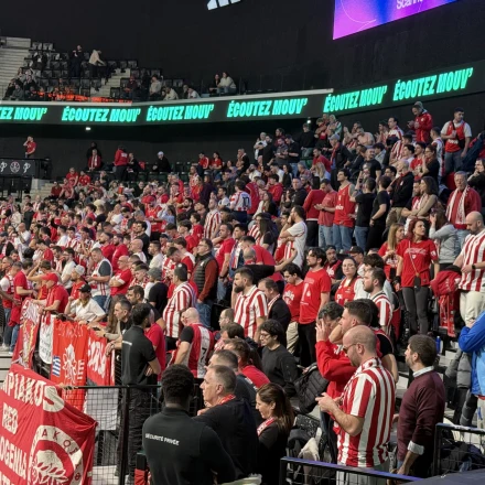 Πανό και ερυθρόλευκο χρώμα στο ένα πέταλο της Adidas Arena με πάνω από 1.500 φιλάθλους να γεμίζουν τις εξέδρες. Μάλιστα πρόκειται για ένα ιδιαίτερο ματς τόσο για τον Τάισον Γουόρντ (που επιστρέφει στο Παρίσι) όσο και για τον Εβάν Φουρνιέ ο οποίος είναι το λεγόμενο...home boy μιας και έχει μεγαλώσει μερικά χιλιόμετρα από την περιοχή Villette που βρίσκεται το γήπεδο της Παρί.