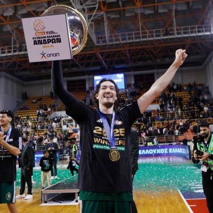 Ο Τούρκος φόργουορντ να πανηγυρίζει για τη νίκη επί του Ολυμπιακού μαζί με φιλάθλους του Τριφυλλιού και λέει στην κάμερα: «Έχουν μείνει ακόμα δύο τίτλοι».