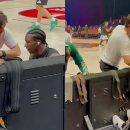 Ο Ματίας Λεσόρ πραγματοποιεί τη προθέρμανσή του στο παρκέ της «Etihad Arena», και ο κόσμος του Πασναθηναϊκού τον αποθεώνει.