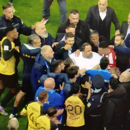 Ο πρόεδρος του Ολυμπιακού, Βαγγέλης Μαρινάκης μπήκε στο γήπεδο για να σταματήσει τη σύρραξη των παικτών των δύο ομάδων στο κέντρο.