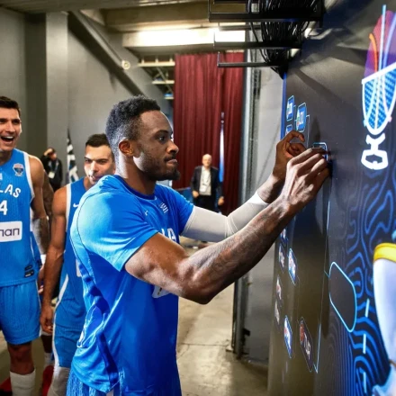 Πλέον, σειρά για να κλέψει την παράσταση πήρε ο Θανάσης Αντετοκούνμπο, που έχει... πάρει το κολάι και το τελετουργικό της FIBA, που στέλνει από κάθε ομάδα έναν παίκτη ώστε να κολλήσει στο αυτοκόλλητό της στο ταμπλό της διοργάνωσης μετά τις προκρίσεις, το ξέρει καλύτερα... και από την παλάμη του.