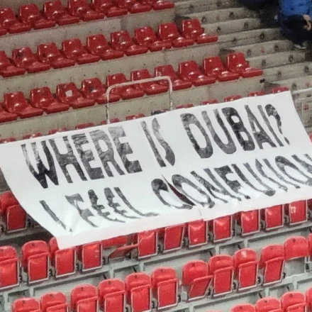 Μάλιστα, στη θέση που κάθονται οι οργανωμένοι των Βάσκων, υπήρχε ένα μεγάλο πανό, το οποίο έγραφε «Πού είναι η Ντουμπάι; Νιώθω μπερδεμένος», με την δεύτερη φράση να παραφράζει το γνωστό «I feel devotion», που αποτελεί σήμα κατατεθέν της διοργάνωσης.