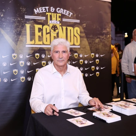 Ο ποδοσφαιριστής με τις περισσότερες συμμετοχές και τους περισσότερους τίτλους στην ιστορία της ΑΕΚ, ο εμβληματικός αμυντικός των δεκαετιών ‘80 και ‘90, συνάντησε τους οπαδούς της Ένωσης στο «AEK Store» πριν τον αγώνα με τον Παναιτωλικό στη Νέα Φιλαδέλφεια, φωτογραφήθηκε μαζί τους και υπέγραψε αυτόγραφα.