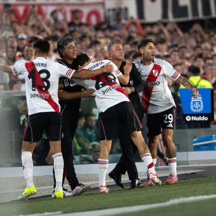 Οι ποδοσφαιριστές της Ρίβερ Πλέιτ πανηγυρίζουν με τον Μαρσέλο Γκαγιάρδο τη νίκη κόντρα στην Μπάνφιλντ / Πηγή: Imago