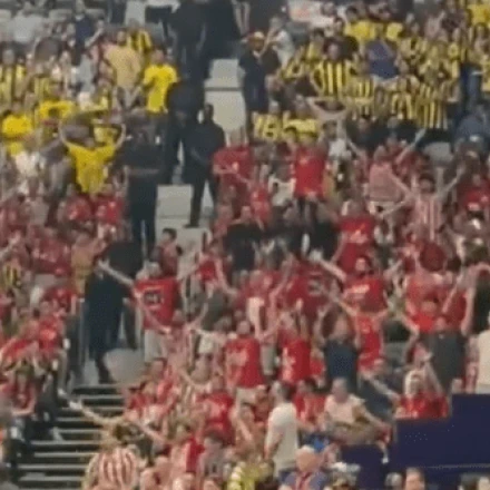 Πιο συγκεκριμένα, οι οπαδοί του Ολυμπιακού, έχουν παραμείνει στις θέσεις τους, τραγουδώντας για την ομάδα τους, η οποία δε βρίσκεται καν στο γήπεδο! Μετατρέποντας σε Στάδιο Ειρήνης και Φιλίας, τα μακρινά Ηνωμένα Αραβικά Εμιράτα.