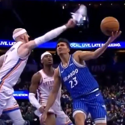 Στο σημείο αυτό, το παπούτσι του Καρούσο είχε βγει και βλέποντας ότι δεν μπορεί να φτάσει τον αντίπαλό του με κάποιον διαφορετικό τρόπο, προέκτεινε το χέρι του έτσι. Το αποτέλεσμα σίγουρα δεν ήταν το αναμενόμενο για τον παίκτη των Θάντερ. Και δέχθηκε το καλάθι λόγω παράνομης απομάκρυνσης και τιμωρήθηκε και με τεχνική ποινή για αυτή του την έμπνευση που σίγουρα παίρνει βραβείο πρωτοτυπίας.