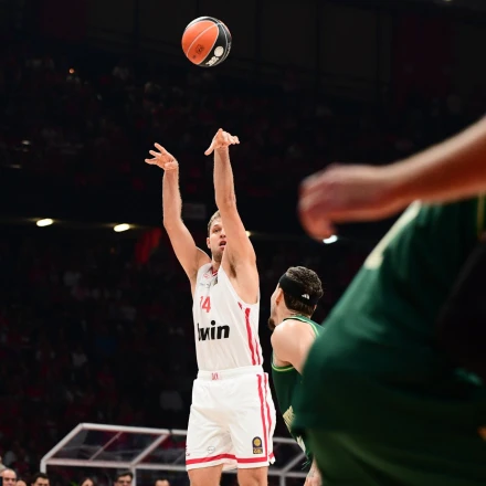 Με ένα εντυπωσιακό σουτ τριών πόντων από τα επτάμιση μέτρα, ο Ολυμπιακός έκλεισε το πρώτο ημίχρονο του ντέρμπι με τον Παναθηναϊκό.