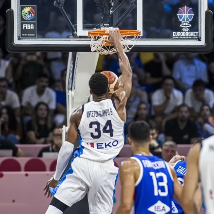 Ο σταρ των Μιλγουόκι Μπακς, βρίσκεται στη Λεμεσό και με κανέναν τρόπο δε μπορεί να τον μαρκάρει η ιταλική άμυνα. Με το σκορ στο 6-4, ο Γιάννης πήρε την μπάλα από τη μια πλευρά του παρκέ, την κουβάλησε σε όλο το μήκος του και τελείωσε εντυπωσιακά τη φάση, σκοράροντας μπροστά σε όλη την αντίπαλη άμυνα, κερδίζοντας και το φάουλ.