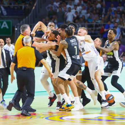 Το γεγονός του ότι το σκορ ήταν στο 95-80 υπέρ των φιλοξενούμενων, οι οποίοι βρίσκονταν μισή ανάσα πριν το 0-2 και το απόλυτο πλεονέκτημα, μένει για λίγο στην άκρη διότι εκείνα που ακολούθησαν κατέληξαν να αναστατώσουν μία και καλή την σειρά. Ο Κέβιν Πάντερ κατεβάζει την μπάλα και έχει απέναντι του τον Σέρχιο Γιούλ. Ο Ισπανός, «παλιοσειρά» στις τάξεις της Ρεάλ Μαδρίτης και ακατάδεκτος στο κομμάτι των αποτυχιών, έχει εκνευριστεί και η άμυνα που παίζει στον Αμερικανό γκαρντ υπερβαίνει τα όρια του φυσιολογικού. Ο Πάντερ δεν δείχνει να μπορεί να διαχειριστεί την πίεση και τον ενθουσιασμό της στιγμής και πιάνεται στα χέρια με τον Γιούλ. Ένας αδιανόητος καυγάς ξεσπά και τα αίματα «ανάβουν» για τα καλά. Οι αναπληρωματικοί και όλα τα στελέχη των ομάδων «την μπαίνουν» ο ένας στον άλλον και το ξύλο μαίνεται.. Αν μπορούσε κάποιος να ξεχωρίσει μία από όλες τις άσχημες στιγμές που είδαμε εκείνο το βράδυ στην Μαδρίτη, θα ήταν το κεφαλοκλείδωμα του Γιαμπουσέλε στον Έξουμ και ο άσχημος τραυματισμός στον ώμο στον οποίο ουσιαστικά τον ανάγκασε. Τα πνεύματα ηρεμούν, το παιχνίδι τελειώνει με το 95-80 υπέρ της Παρτιζάν, η οποία γυρίζει «σπίτι» έχοντας δύο «match ball» στα χέρια της αλλά και πολλή ένταση & απουσίες να διαχειριστεί.
