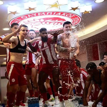 Ο Ολυμπιακός γιόρτασε για τα καλά τη κατάκτηση του πρωταθλήματος στα αποδυτήρια του Σταδίου Γεώργιος Καραϊσκάκης.