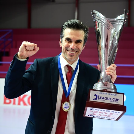 Ο Έλληνας τεχνικός πανηγύρισε το πρώτο του τρόπαιο ως πρώτος προπονητής, μετά τη νίκη της ομάδας κόντρα στον ΠΑΟΚ με 3-1 σετ στον τελικό του League Cup «Νίκος Σαμαράς».